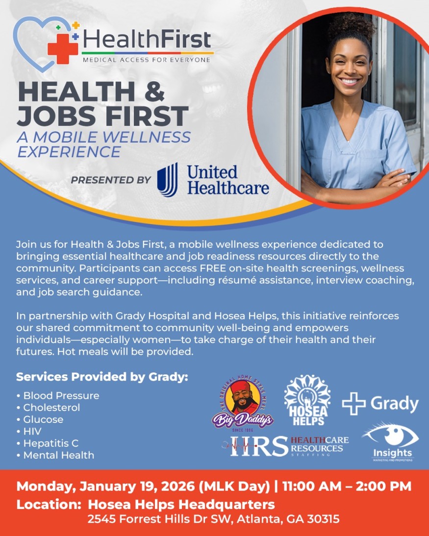 Join us for Health & Jobs First, a FREE mobile wellness and career support event dedicated to meeting the community where they are-because access to care and opportunity should never be out of reach.